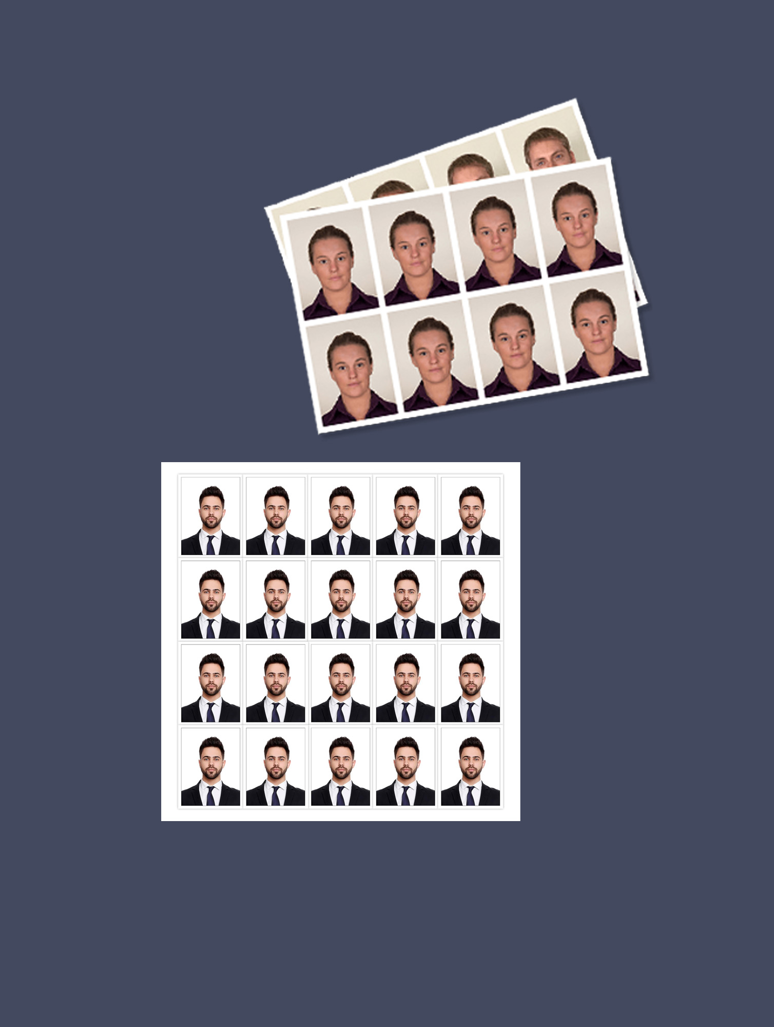 Photo printing in standard and custom sizes (up to A4), including passport and ID photos.