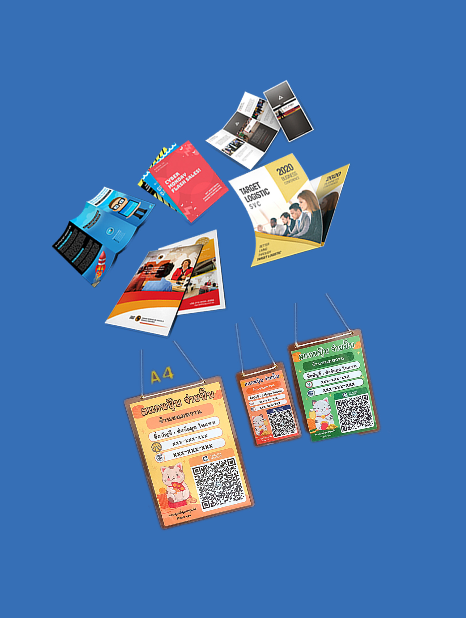 ကြော်ငြာစာရွက်၊ ဘရိုရှာ၊ မီနူးနှင့် QR ငွေပေးချေမှုပြကွက်များအတွက် ဒီဇိုင်းနှင့် ပုံနှိပ်ဝန်ဆောင်မှုများ။